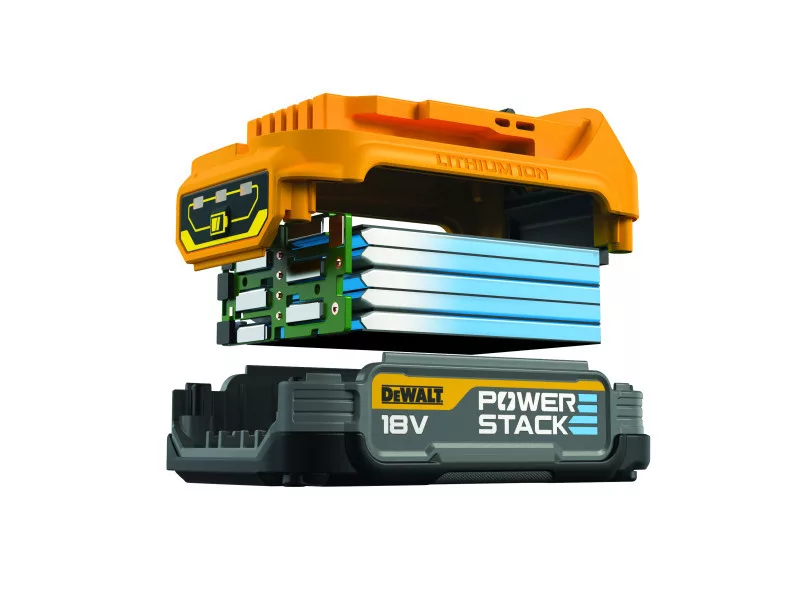 A kompakt 18 V XR POWERSTACK™ akkumulátor az első olyan akkumulátor a világon, amely a lapos akkumulátorcellák technológiáját használja az építőiparban.