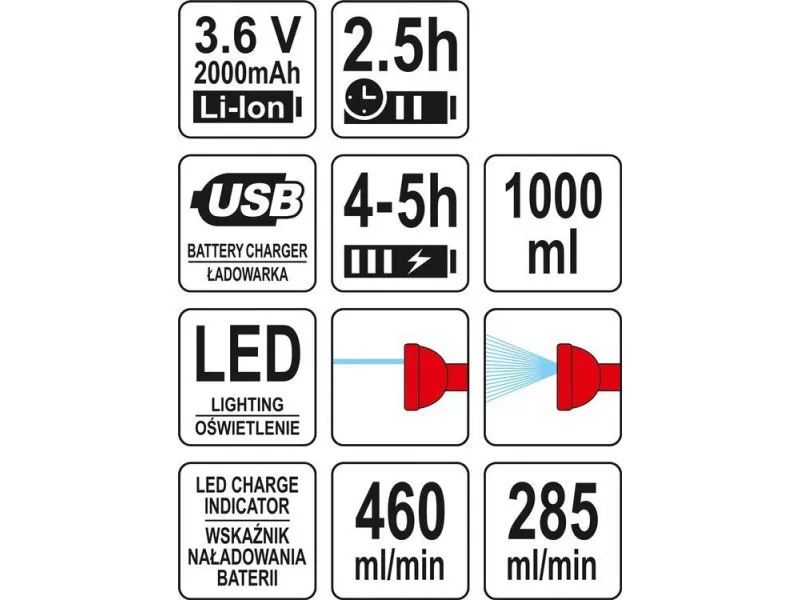 YATO Akkus permetező 1000 ml 3,6 V Li-Ion (1 x 2,0 Ah + töltőkábel)